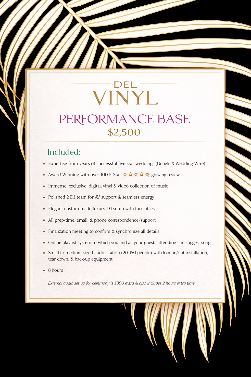 DEL VINYL SPECIAL EVENTS PDF DEL VINYL FL SPECIAL EVENTS PDF DEL VINYL WEDDING PDF DEL VINYL FL WEDDING PDF View fullsize View fullsize View fullsize View fullsize View fullsize View fullsize View fullsize ADD ONs $300/Hour$350 Extra Turntable Setup (*if needed) 2 units with 3–4 cues $700